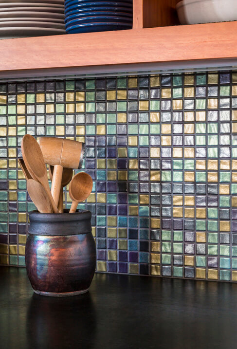 - Blue, green, and white mosaic glass tile are an ideal fit (think sea glass!)
