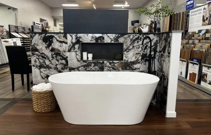 At Martins Flooring Fivepointville location, we have recently installed five new vignettes in our showroom. One of these displays is this luxurious free standing tub with 12″ x 24″ horizontally…